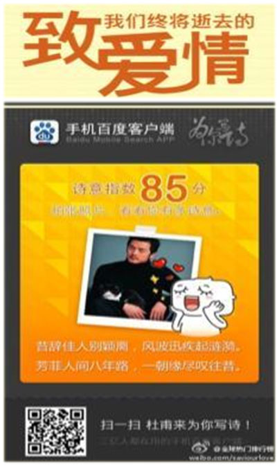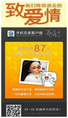本次策划,菲鹏微博爆出几小时后即做出了应对,精妙地将“菲鹏事件”与手机百度写诗功能结合起来,进行一轮热力炒作的内容营销。